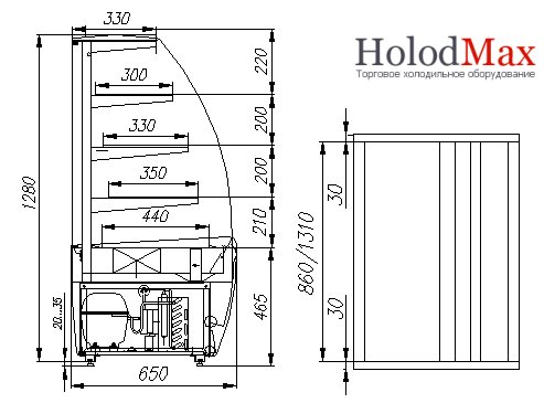 Микропроцессорный управляющий блок оборудован индикатором температуры, так что управлять витриной легко и удобно. Изоляция корпуса, столешницы и боковин изготовлена из пенополиуретана.