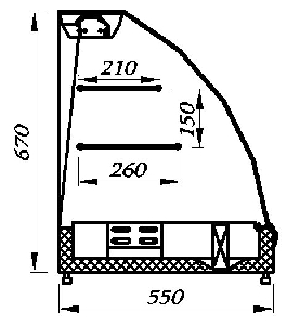 Ширина выкладки товара составляет 470 мм. Также в этой витрине установлены две стеклянные полочки, за счёт которых увеличивается полезная площадь выкладки. Температура внутри витрины выставляется вручную с помощью термостата в пределах от +6 до +12 ºС. Особенностью этой холодильной витрины является не только её изящный дизайн, но и использование новейших холодильных агрегатов шведской фирмы Electrolux, что гарантирует её долгую и безупречную работу. Внутри витрины осуществляется динамическое охлаждение с помощью встроенной системы вентиляции.