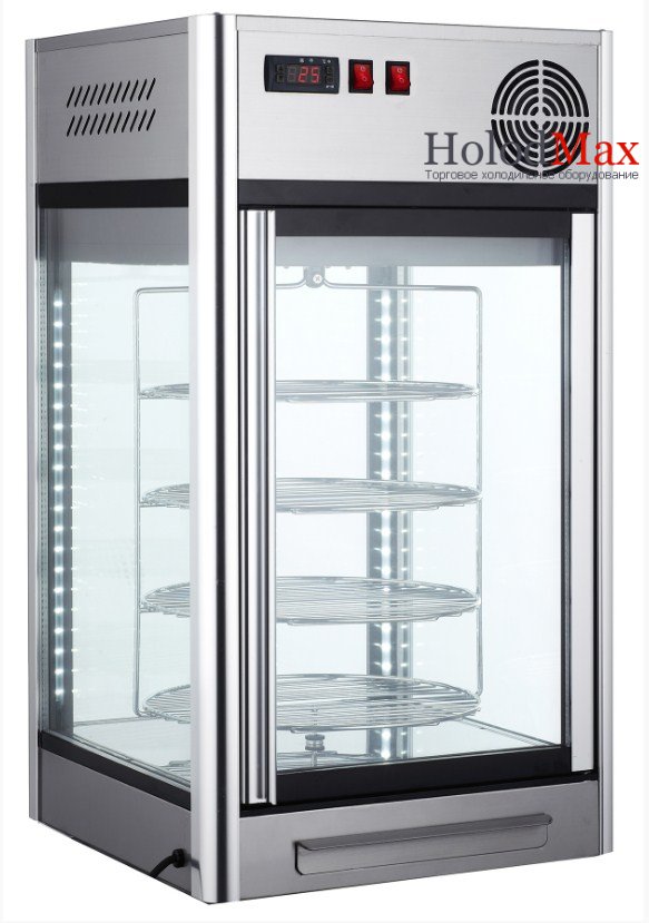Настільна кондитерська холодильна вітрина з 4 поворотними хромованими полицями діаметром 355 мм. Вертикальне ярусне розташування викладки дозволяє оптимально використовувати обмежені площі прилавка, а обертання полиць унеможливлює наявність мертвих оглядових зон. Корпус нерж. сталь. Обєм 108 л. Двостороннє бокове світлодіодне (LED) підсвічування. Цифрова панель управління. Подвійне скло. Регульовані ніжки. Працює на безпечному холодогенті R600a.