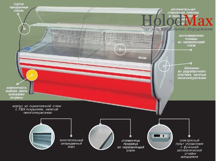 Холодильная среднетемпературная витрина РОСС - GOLD 1.1 - 1.5 (ГОЛД, Украина) - используется для демонстрации и кратковременного хранения гастрономической группы товаров, колбаса, сыр, молочка. Холодильная витрина имеет электронный пульт с автоматической оттайкой испарителя. Выставочная площадь и столешница продавца из нержавеющей стали. Корпус из оцинкованной стали с полимерным покрытием, заполненный пенополиуретаном. Боковые части из ударопрочного пластика заполнены пенополиуретаном. Наличие запасника под выкладкой, для хранения. Есть возможность выбора цвета основания.
