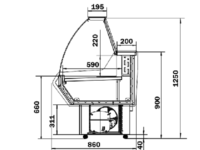 Фронтальное закаленное гнутое стекло. Ширина выкладки товара составляет 590 мм. Даная витрина работает в температурном режиме от 0 до +8 ºС который регулируется с помощью электронного пульта управления со встроенной функцией автоматической оттайки испарителя. Также внутри витрины есть вместительный охлаждаемый бокс, высота 22,5 см, в котором можно хранить продукцию. Материал выкладки и столешницы со стороны продавца - нержав.сталь.