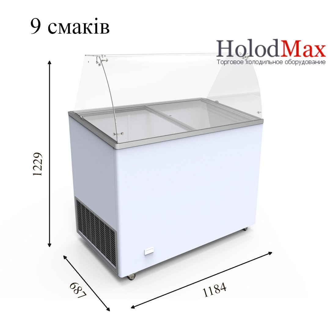 Показатель температуры и панорамное освещение. . Гнутое стекло, 4 колеса для легкого перемещения витрины. Сливная трубка. Корзина для помещения лотков с мороженым. Внутренняя отделка корпуса из прочной стали. Внутренние размеры (д x ш x в) - 1184 x 687 x 1229 мм.