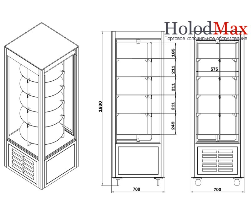 Цветовое исполнение стандарт - бронза RAL 1036. Остекление с четырех сторон - стеклопакет. Управление температурным режимом - электронный пульт с функцией автоматической оттайки испарителя по температуре.