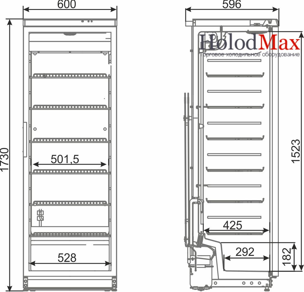 Вместительность бутылок РЕТ (пластик): 0,5 л - 154; 0,33 л - 322 штук. Цвет холодильника белый. Дверь – стеклопакет в пластиковой раме чёрного цвета. Реверсивная дверь позволяет во время монтажа изменить решение о сторонности открывания. Без замка.