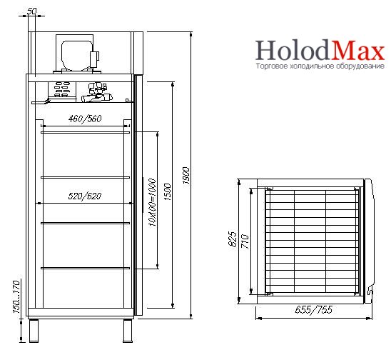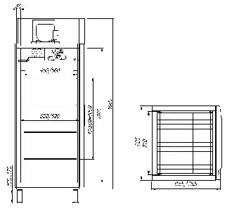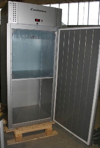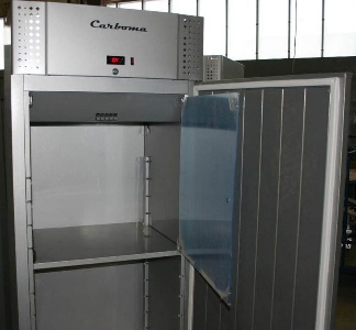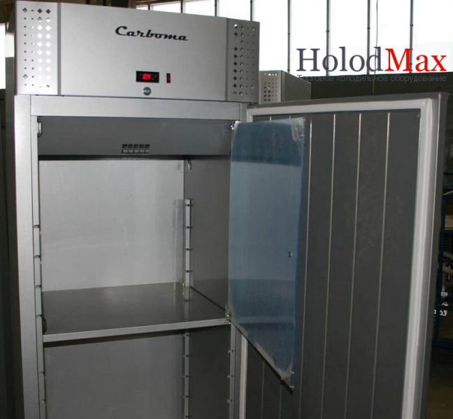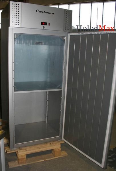 Объем холодильного шкафа Carboma RF700 делится на две равные части горизонтальной термоизолирующей перегородкой. Она отделяет верхнюю морозильную камеру от нижней холодильной. Низкотемпературная камера закрыта дополнительной дверцей из оргстекла. Особенность данной модели - верхнее размещение холодильного агрегата. Корпус выполнен из оцинкованной стали, цвет серый металлик (RAL 9006). Шкаф Carboma RF 700 имеет одну распашную глухую дверь, оснащен компрессором Danfoss, фреон R404а, тип охлаждения динамический. В стандартную комплектацию входит: регенеративный теплообменник, эргономичная ручка, встроенная по всей длине двери, возможность перенавески двери, прочные полки-решетки с возможностью установки под углом, встроенный замок. К замку идут 2 ключа. В комплекте 4 полки, нагрузка на полку не более 30 кг. Возможно изготовление шкафов в белом цвете или из нержавеющей стали. Корпус шкафа, дверь и дверца из оргстекла закрыты защитной пленкой из полистирола. После монтажа пленка удаляется.