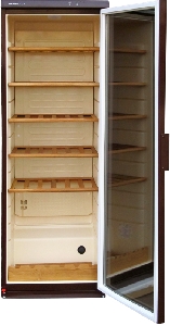Полки изготовлены из натурального дуба, что еще более повышает престижность модели. Содержимое шкафа отлично просматривается через слегка затемненное стекло витрины. Освещение внутри шкафа для вина включается автономно.