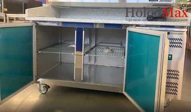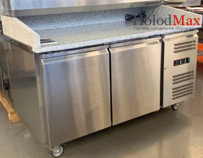 Внутри стола хранятся тестовые заготовки и проходят процесс ферментации, на гранитной столешнице готовят краст и укладывают начинку, а в охлаждаемой витрине хранится сама начинка. Это очень удобное и необходимое профессиональное оборудование на кухне любого ресторана, кафе, бара и больших предприятиях.