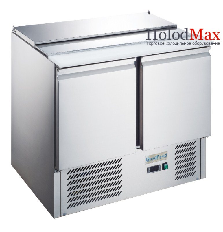 Саладета GoodFood GF-S900-H6C. Секції для гастроємностей призначені для короткочасного зберігання та демонстрації салатів, закусок, гарнірів тощо. Загальний холодильний обєм за дверима використовують для зберігання продуктів. Стільниця виконана з білий харчовий пластик, яку використовують, як дошку для нарізання.