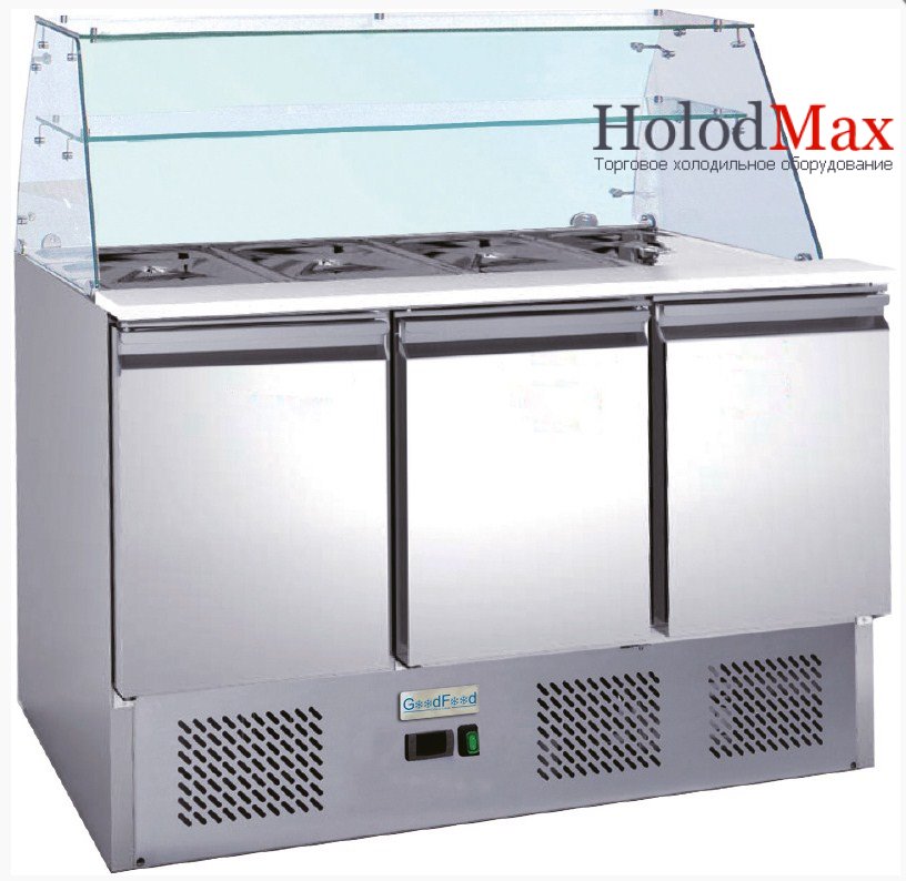 Саладета GoodFood GF-S903SQ-HC - секції для гастроємностей призначені для короткочасного зберігання та демонстрації салатів, закусок, гарнірів тощо. Загальний холодильний обєм за дверима використовують для зберігання продуктів.