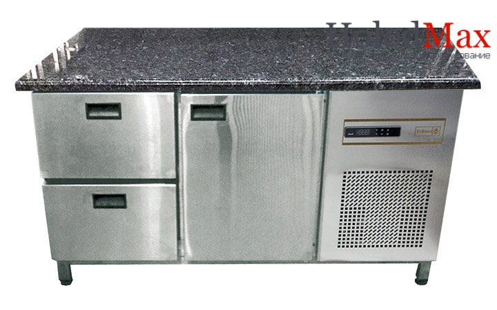 Холодильный стол Tehma 1177 с гранитной столешницей 2 двери + 2 ящика, без борта выполнен из нержавеющей пищевой стали. Температура окружающей среды до +35С. Температурный режим +2...+8С. Объем камеры = 420л, max потребляемая мощность = 0,748 кВт. Без борта, компрессор Lunite Hermetique (Франция), блок управления Dixell (Италия), динамическое охлаждение, автоматическое оттаивание. Толщина теплоизоляции 50мм.