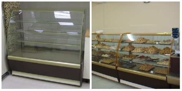 Количество полок 3 шт, размеры: 1я — 300*1310 мм, 2я — 330*1310мм, 3я — 350*1310 мм. Материал полок — стекло, а нижний уровень витрины выполнен из оцинкованной стали золотого цвета. Современная LED подсветка каждой полки, длинна подсветки 60-70 см. Загрузка витрины через раздвижные задние створки из оргстекла.
