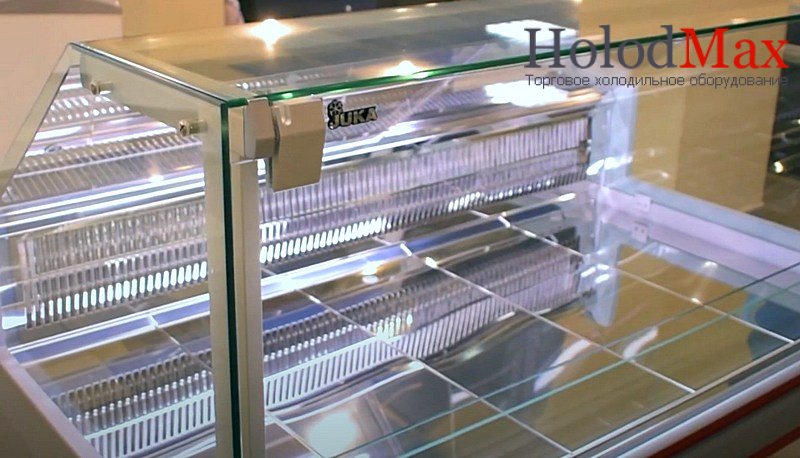 Среднетемпературная холодильная гастрономическая витрина Juka FGL260А (куб) с откидными стеклами на газлифтах, предназначенная для реализации сырных, молочных, колбасных, мясных и рыбных продуктов.