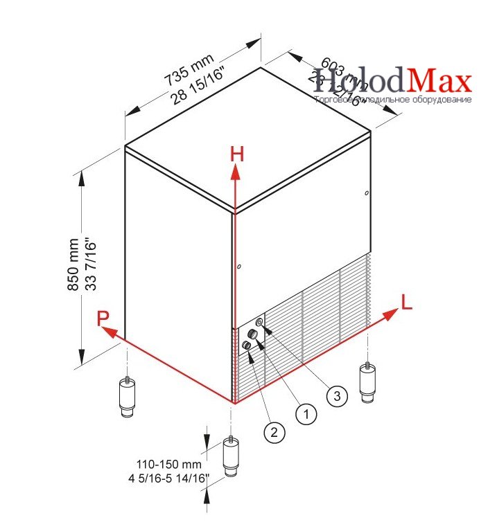 Бункер встроенный (объем 40 кг), производительность до 72 кг/сутки, охлаждение воздушное, вес кубика льда 23 г (L32,5хh31.5), хладогент R290.