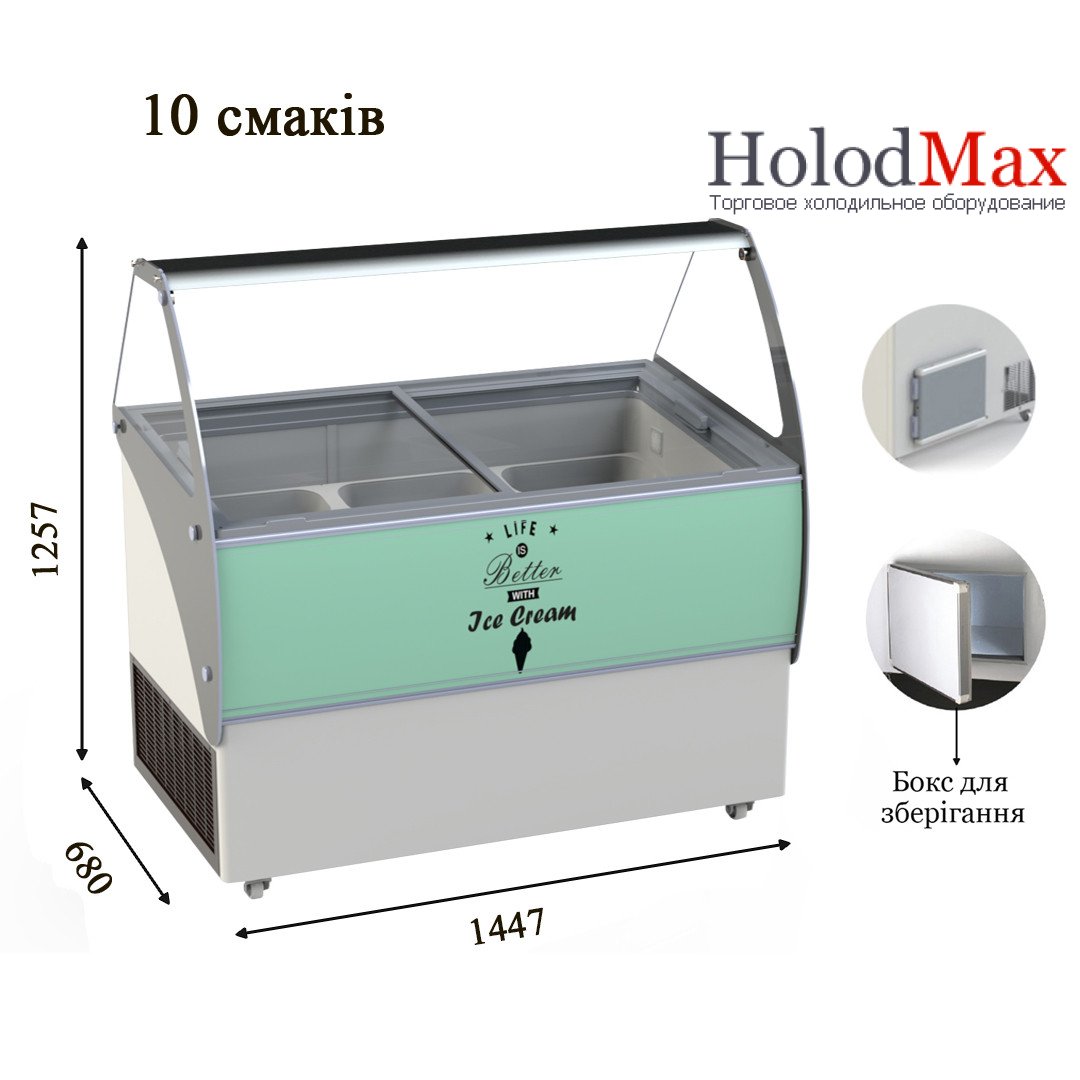 Корпус белого цвета. . Освещаемая рекламная панель LED. Гнутые стекла. Охлаждаемая камера с дверцей для хранения запаса товара! Гнезда из нержавеющей стали для лотков, 4 колеса для легкого перемещения витрины. Электронный термометр, освещение. Внутренняя отделка корпуса из нетоксичной стали. Внутренние размеры (д x ш x в) - 1447 x 680 x 1257 мм.