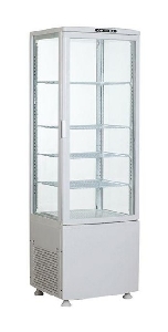 Демонстраційна холодильна вітрина-шафа Frosty FL238 в чорному або білому кольорі зі світлодіодним підсвічуванням і чудовим оглядом з чотирьох сторін гарне рішення для демонстрації і продажу продуктів і напоїв.