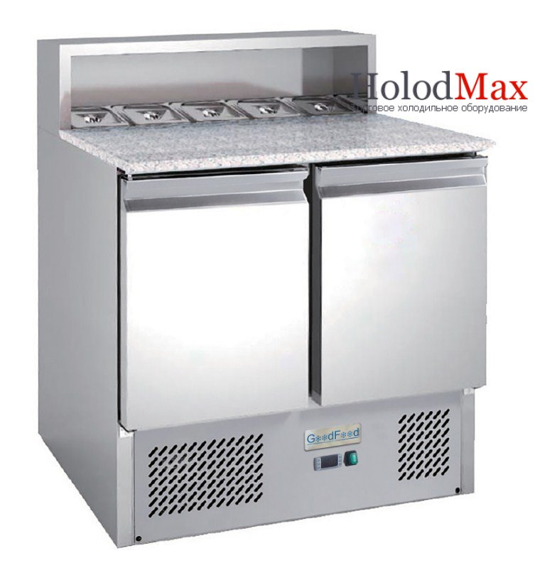 Саладета GoodFood GF-PS900-H6C. Секції для гастроємностей призначені для короткочасного зберігання та демонстрації салатів, закусок, гарнірів тощо. Загальний холодильний обєм за дверима використовують для зберігання продуктів.