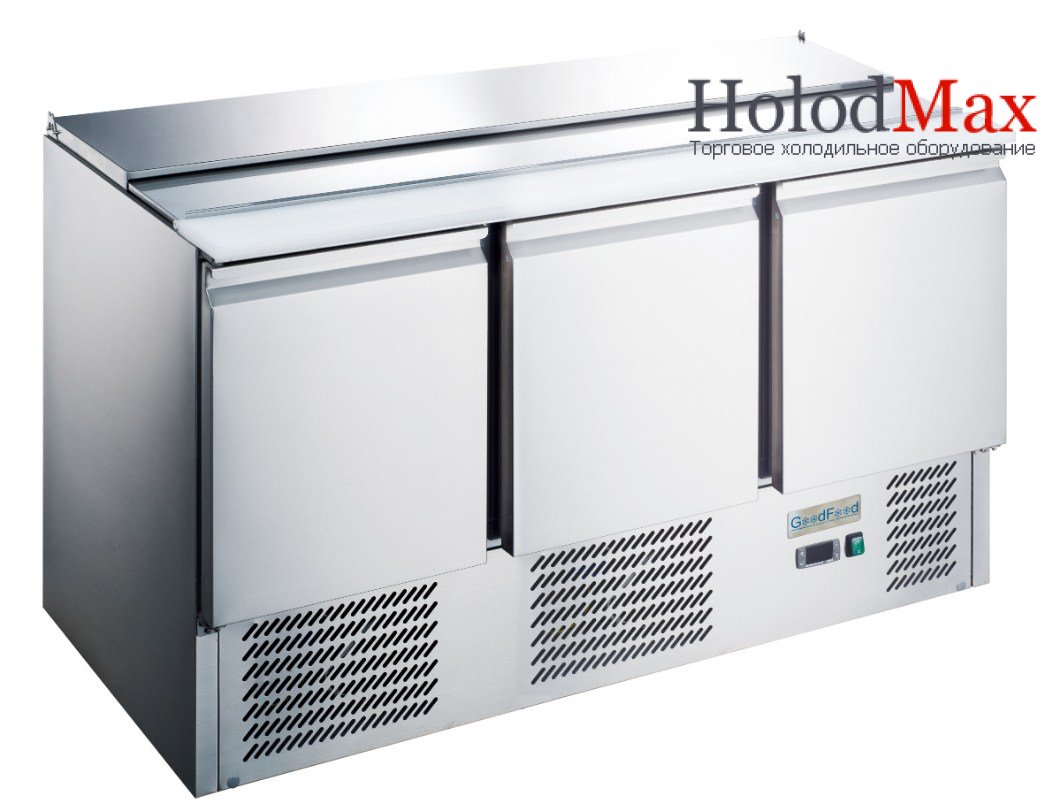 Саладета GoodFood GF-S903-HC. Секції для гастроємностей призначені для короткочасного зберігання та демонстрації салатів, закусок, гарнірів тощо. Загальний холодильний обєм за дверима використовують для зберігання продуктів. Стільниця виконана з білий харчовий пластик, яку використовують, як дошку для нарізання.