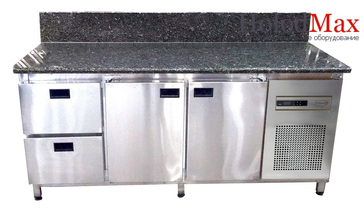 Холодильный стол Tehma 1179 с гранитной столешницей на 2 двери + 2 ящика с задним бортом выполнен из нержавеющей пищевой стали. Температура окружающей среды до +35С. Температурный режим +2...+8С. Объем камеры = 420л, max потребляемая мощность = 0,748 кВт. Задний борт - высота 20см, толщина 3см. Компрессор Lunite Hermetique (Франция), блок управления Dixell (Италия), динамическое охлаждение, автоматическое оттаивание.